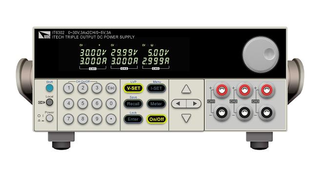 IT6302三通道可編程直流電源,可提供兩路0-30V/0-3A,一路0-5V/0-3A輸出。三路之間完全隔離,用戶可單獨調節每路輸出或進行串并聯以獲得更高的電壓電流值(僅CH1和CH2)。此外CH1和CH2可設置為同步模式,當CH1輸出改變時,CH2的輸出也成相應比例變化。IT6302是一款適用于電子產品測試、生產以及需求多通道電源場合的理想產品。產品性價比高,節約工作臺空間。