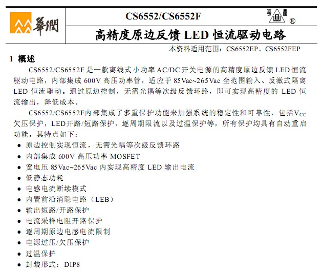 CS6552/CS6552F是一款離線式小功率 AC/DC開關電源的高精度原邊反饋 LED恒流