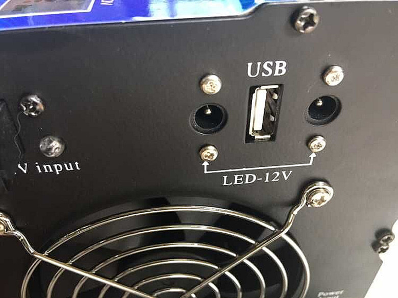 - 前面板帶液晶顯示屏、220V輸出萬能插座、逆變開關;機后帶太陽能充電輸入插座、帶5VUSB插座、兩個12VLED燈插座,內置45A自動智能充電系統 ;同時帶大功率散熱風扇。