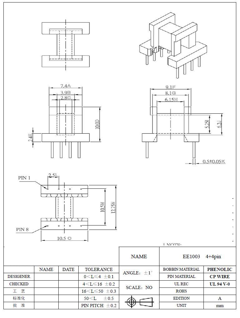 高頻變壓器EE10磁芯+骨架臥式4+4針描述