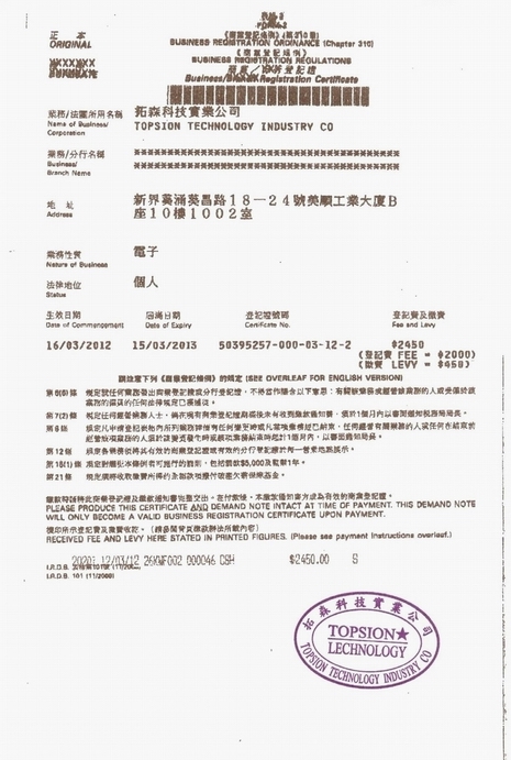 拓森科技2012年香港商業登記證