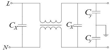 電源濾波器安裝在電源線與電子設(shè)備之間,用于抑制電源線引出的傳導(dǎo)干擾,又可以降低從電網(wǎng)引入的傳導(dǎo)干擾,對提高設(shè)備的可靠性有重要的作用。開關(guān)電源產(chǎn)生的電磁干擾以傳導(dǎo)干擾為主,而傳導(dǎo)干擾又分差模騷擾和共模干擾兩種。構(gòu)成開關(guān)電源EMI濾波器的基本網(wǎng)絡(luò)如圖1所示。該濾波器由共模扼流圈L、差模電容Cx和共模電容Cy組成。共模扼流圈L由兩個(gè)繞在同一個(gè)高磁導(dǎo)率磁芯上的繞組構(gòu)成,其結(jié)構(gòu)使差模電流產(chǎn)生的磁通相互抵消。這種結(jié)構(gòu)以較小體積獲得較大的電感值,并且不用擔(dān)心由于工作電流導(dǎo)致飽和。每個(gè)繞組與電容Cy分別組成L-E和N-E兩對獨(dú)立端口的低通濾波器,形成共模濾波網(wǎng)絡(luò),用來抑制電源線上存在的共模干擾。至于共模扼流圈L、差模電容Cx和共模電容Cy的取值大小,應(yīng)盡量做到濾波器的諧振頻率低于開關(guān)電源的工作頻率,這樣可以實(shí)現(xiàn)對整個(gè)頻段的濾波。