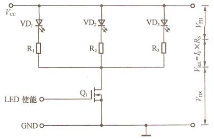白光LED為電流驅動器件,光輸出強度由流過LED的電流決定。圖3所示的是由電壓源和限流電阻構成的一種簡單偏置電路,流過白光LED的電流由下式確定:IDIODE=(VCC-VF)/(RLIM+RDS(ON)) (1)