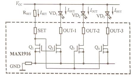 MAX1916為專用白光LED驅動集成電路,它提供了一種先進的白光LED電流偏置電路。MAX1916在微型SOT-23封裝內集成了三組電流源,流過RSET的電流鏡像到三個輸出端,如圖8所示。電路中幾個相同的MOSFET管具有相同的柵源電源,因此,它們的溝道電流相同,電流的大小由鏡像電流ISET決定。MAX1916的最大電流失配度為±5%,“鏡像系數”為200A/A。也就是說,當ISET為50μA時,每個輸出端的電流為10×(1±0.05)mA(最大值)。SET端由內部偏置在1.25V。ISET由下式決定: