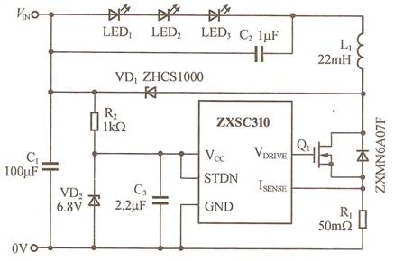 當MOSFET管(Q1)導通時,電流從輸入端流過白光LED、并聯濾波電容器(C2)、電感(L1)、Q1及檢測電阻(R1),電流值由檢測電阻值和ZXSC310檢測電壓的閾值(通常為19mV)所決定。