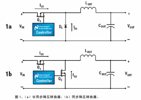 圖1是非同步和同步降壓轉(zhuǎn)換器的原理圖。非同步降壓轉(zhuǎn)換器使用FET 和肖特基二極管作為開(kāi)關(guān)器件(圖1a),當(dāng)FET打開(kāi)時(shí),能量傳遞到輸出電感和負(fù)載。當(dāng)FET關(guān)斷,電感中的電流流過(guò)肖特基二極管。如果負(fù)載電流高于輸出電感的紋波電流的一半,則轉(zhuǎn)換器工作在連續(xù)導(dǎo)通模式。根據(jù)正向電壓降和反向漏電流特性來(lái)選擇肖特基二極管。但是,當(dāng)輸出電壓降低時(shí),二極管的正向電壓的影響很重要,它將降低轉(zhuǎn)換器的效率。物理特性的極限使二極管的正向電壓降難以降低到0.3V以下。相反,可以通過(guò)加大硅片的尺寸或并行連接分離器件來(lái)降低 MOSFET的導(dǎo)通電阻RDS(ON)。因此,在給定的電流下,使用一個(gè)MOSFET來(lái)替代二極管可以獲得比二極管小很多的電壓降。