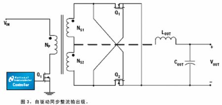 自驅(qū)動(dòng)方案是最簡(jiǎn)單、直接的SR驅(qū)動(dòng)方案(圖3),適合于那些在任何時(shí)間段內(nèi)變壓器電壓都不為零的拓?fù)浣Y(jié)構(gòu)。兩個(gè)SR FET可替代輸出整流二極管,次級(jí)繞組產(chǎn)生的電壓驅(qū)動(dòng)SR的柵極。在大多數(shù)情況下,利用不同的變壓器線(xiàn)圈匝數(shù)比(NP∶ NS1∶NS2)和正確選擇SR FET,相同的拓?fù)浣Y(jié)構(gòu)可以獲得更高或更低的輸出電壓。■