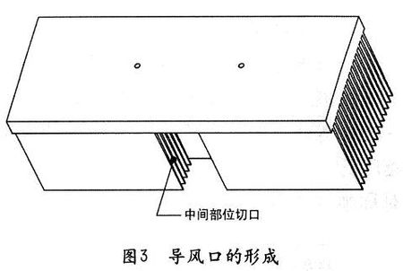 3)為實(shí)現(xiàn)轉(zhuǎn)90°的風(fēng)道,散熱器的齒需要特殊加工,將其中的幾片齒從中間銑去一部分,形成導(dǎo)風(fēng)口,如圖3所示。