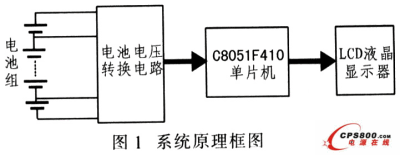 便攜式串聯電池組電壓檢測系統由電池電壓轉換電路、C8051F410單片機和LCD液品顯示器組成,如圖1所示。