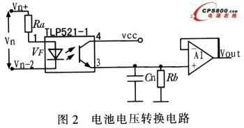 電池電壓轉換電路如圖2所示,該轉換電路是南普通光耦TLP521-1和運算放大器A1組成,電阻Rb為采樣電阻,電容Cn用來提高抗干擾能力。