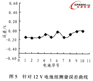 在電壓測量實驗中,Ra=5 kΩ,Rb=5 kΩ,運算放大器選LM324,對比參考測試設備為安捷倫34401(直流電壓測試精度為0.001 V)。由10節電池組成的電池組進行測試,表1為系統測試電壓對比,圖5為測量誤差。由表1和圖5可得出,12 V電池組系統測量誤差小于0.1%。