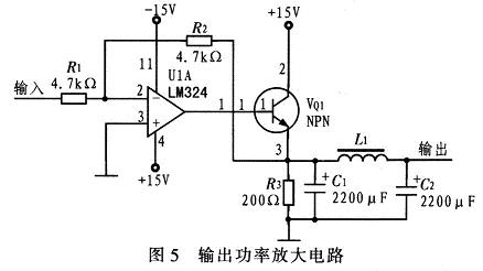 雖然D/A轉(zhuǎn)換電路輸出電壓幅值大小滿足任意可設要求,但其輸出電流過小,不能驅(qū)動負載。為增大輸出電流,增強帶負載能力,還需設計一個電壓增益為1的功率放大電路,其電路如圖5所示。圖5中,R1、R2和LM324構(gòu)成一個電壓增益為1的反相比例放大電路;VQ1為大功率三極管,在加散熱片的條件下,最大輸出電流可達到3 A;C1、L1和C2構(gòu)成π型LC濾波器,可進一步濾除電源的波紋,提高電源的輸出性能。