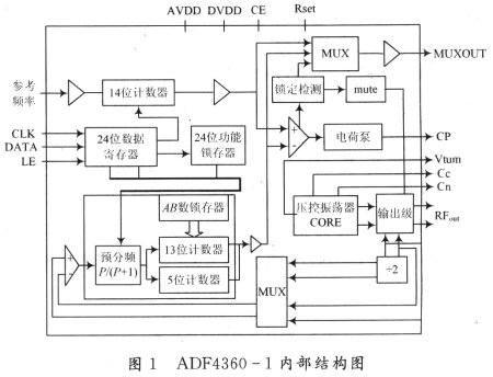 ADF4360-1主要由數(shù)字鑒相器、電荷泵、分頻器、計數(shù)器及雙模前置P/(P+1)分頻器等組成。如圖1所示。