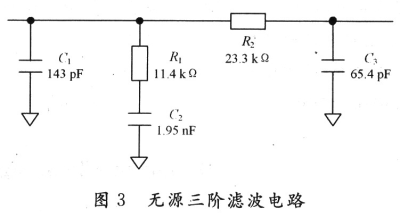利用AD公司提供的專用設計與仿真工具軟件ADI simPLL對圖2結構形成的無源三階濾波電路進行仿真、設計。依照軟件提示,逐步設定各項參數(shù),并選擇芯片型號和環(huán)路濾波器形式,最后生成的電路如圖3所示。