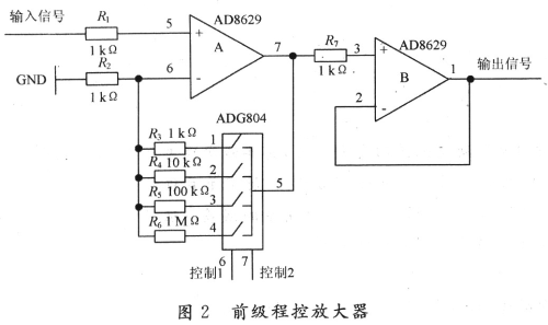 該部分中,實現增益控制主要依靠通道選擇,本方案中采用四通道選擇器ADG804,該器件導通電阻小于0.8 Ω,單電源供電,封裝小,溫度適應性強,通過地址線A0和A1選擇導通路。單片機I/O口送數至ADG804的地址輸入端,選擇不同的反饋電阻值Rf,通過式(1)得到不同的放大增益系數G,進而確定事先定義的不同檔位的切換。G=Vo/Vi=Rf/Ri (1)