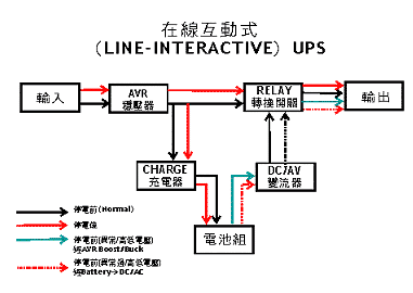 其原理與后備式不斷電系統相去不遠,其主要不同在于此類產品將充電回路與變流器整合為雙向轉換回路,可自動偵測輸入電壓是否符合于正常范圍內,如有偏差可由穩壓電路升壓或降壓,提供較穩定之輸出電壓,其它工作原理與后備式相同。可參閱在線互動式不斷電系統方塊圖。