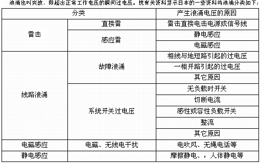 浪涌也叫突波,即超出正常工作電壓的瞬間過電壓。擾有關資料顯示日本的一些資料將浪涌分類如下: