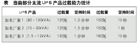 廠商會有哪些應對辦法呢?廠商最常見的手段是從UPS主機上打主意, 使原來的價格大幅度降價,但卻給用戶埋下了隱患。比如, 已往UPS的過載能力普遍為: 過載到 125%,可堅持10分鐘,過載到150%,可堅持30秒。但這些降價后的產品過載能力大大降低(參見下表),由此可以看出機器降價的原因。機器價格下來了,事故隱患上去了。