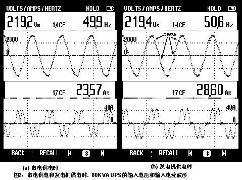 (b) 此時,將電力穩壓器從這套UPS供電系統中脫離出來,并直接用150KVA 的發電機來直接驅動”1+1”UPS并機系統。運行結果表明:工作基本正常。