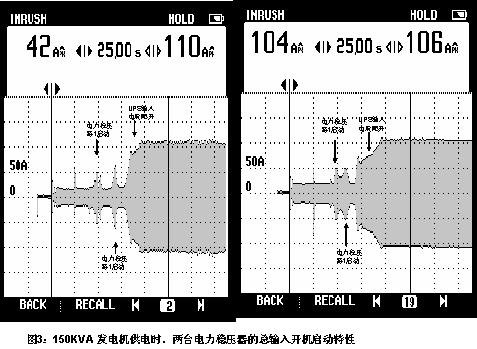 在150KVA發電機供電條件下、釆用手動切換操作的方法,從市電供電切換到發電機供電后、所測得的UPS供電系統的兩次”開機啟動輸入電流”的典型波形圖被示于3中。從該圖可以清晰地、分別地觀察到三種啟動浪涌電流:電力穩壓器1的開機啟動浪涌電流、電力穩壓器2的開機啟動浪涌電流、UPS的緩啟動輸入“爬升”電流。從這樣的測試結果可以得到如下結論:在釆用將兩臺電力穩壓器的”開機啟動浪涌電流”的出現時間“錯開”3秒左右的技術措施之后,所帶來的明顯好處是:它大大地降低了在毎臺電力穩壓器被開機啟動時所可能產生的瞬態浪涌電流的幅度,經多次開機啟動測試后,發現:在此條件下,可能出現在兩臺電力穩壓器的輸入端的瞬態電流的峰值都小于100A。與此相反,在未釆用這樣的技術措施之前,曾經被檢測到的最大浪涌電流的峰值卻高達220A左右。