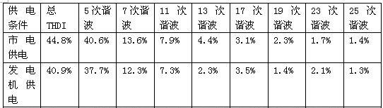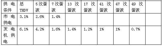 表1:在市電供電和發(fā)電機供電條件下的80KVA的6脈沖UPS的輸入電流諧波分量THDI%r和輸入電壓諧波分量THDV%r的頻譜分佈特性