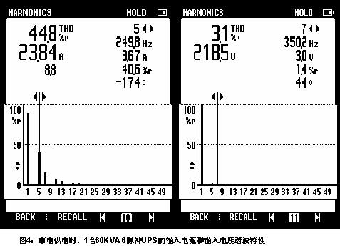 相關(guān)的檢測數(shù)據(jù)表明:對于同一套UPS供電系統(tǒng)言,當它處于發(fā)電機供電的條件下運行時,它的輸入電壓諧波分量明顯地高于在市電供電條件下的輸入電壓諧波分量。我們從這套UPS供電系統(tǒng)上所檢測到的數(shù)據(jù)是:對于出現(xiàn)在兩臺電力穩(wěn)壓器的總輸入端的輸入電壓諧波分量而言,在市電供電時和在發(fā)電機供電的的THDV分別為2.8%和5.1%。對于在出現(xiàn)80KVA UPS的輸入端的輸入電壓諧波分量而言,在市電供電時和在發(fā)電機供電的的THDV分別為3.1%和6.1%。從圖4和5還可觀察到:在驅(qū)動相同的整流濾波型非線性UPS負載時,通過降低輸入電源的內(nèi)阻不僅可以有效地降低UPS的輸入電壓諧波分量THDV。而且,還可以有效地消除由UPS反饋到輸入電源中的高次電流諧波分量THDI(n)%所可能在輸入電源上所產(chǎn)生的高次電壓諧波分量THDV(n)%。例如:當市電供電時,出現(xiàn)在80KVA UPS輸入端的輸入電壓諧波分量主要集中在5次和7次等低次輸入電壓諧波分量上。然而,在釆用具有較高內(nèi)阻的發(fā)電機供電時,我們不僅可以觀察到5次、7次、13次和17次等的輸入電壓諧波分量。而且,還可以觀察到由UPS的IGBT逆變器的脈寬調(diào)制所產(chǎn)生41次、47次和49次等的高次輸入電壓諧波分量。為此,過去為UPS業(yè)界所經(jīng)常釆用的技術(shù)措施是:利用增大發(fā)電機的輸出功率和UPS的輸出功率的容量比的辦法來改善發(fā)電機的帶載特性,其實質(zhì)是通過增大發(fā)電機的容量的辦法來降低發(fā)電機的內(nèi)阻。