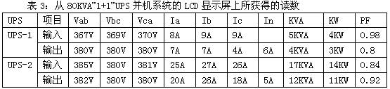 從UPS的LCD顯示屏上所讀取的電流、KVA和KW等UPS的實時運行參數(shù)值較大地偏離它的現(xiàn)場實測值,需要重新較正。否則,易于導致相關(guān)的操作人員產(chǎn)生”誤解”(注:此類現(xiàn)象,在其它安裝現(xiàn)場、也曾出現(xiàn)過)。