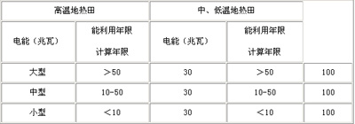 根據(jù)地?zé)峥辈閲覙?biāo)準(zhǔn)GB11615─89規(guī)定,地?zé)豳Y源按溫度分為高溫、中溫、低溫三級,按地?zé)崽镆?guī)模分為大、中、小三類(見表4-2、4-3)。