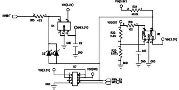 U3的軟啟動電路可控制上電速率, 軟啟動延時時間大約為5~10ms,整個上電過程在15ms完成,典型軟啟動時間為6.5ms。在軟啟動功能運行時,TRACK管腳必須連接輸入電源電壓管腳,屏蔽POLA模塊的自動電壓跟蹤功能。此時,模塊電源的上電受內部的軟啟動上電模塊控制。