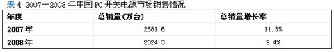 2007年,中國開關電源市場保持穩定增長,總體銷售量為2081.6萬臺。2008年PC開關銷量2824.3萬臺,增長率為9.4%。