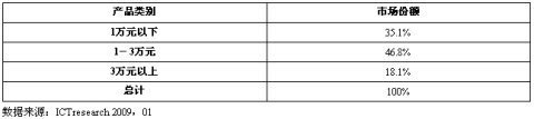 從價格段的角度來看,2008年1萬元以下及1-3萬元通信電源產品的市場份額分別達到41.2%和33.8%。二者之和則占據了整體市場的四分之三,處于中國通信電源市場的主流地位。3萬元以上的產品受價格的限制,其份額相對較低。未來3-5年,隨著中國通信市場的不斷成長壯大,8預計3萬元以下的市場規模將會有更進一步的增長。