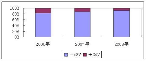在中國通信電源市場上,2008年仍然是以-48V產品為主流,+24V產品緊隨其后,主要原因為現在電信設備主要采用-48V產品,+24V產品主要為維修及固網用戶少量設備在使用,綜合造成了+24V產品增量較小。從發展勢頭看,更安全、更節能的產品市場前景更值得期待。