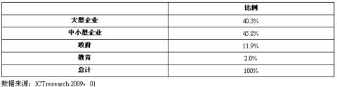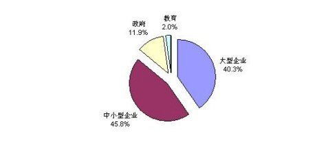 將中國IT應用市場垂直劃分為:大型企業市場、中小型企業市場、政府市場、教育市場和家庭市場五種類型。其中前面兩種企業市場屬商用市場,又可平行劃分為銀行、保險、證券、電信、郵政、交通、電力、石油石化、煤炭與其它能源、物流、流通、制造、建筑、科研、媒體、衛生等行業應用市場(平行市場);后面三種(包括政府、教育、家庭市場)屬于非商用市場。