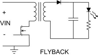 出于安全考慮,可能規(guī)定在離線電壓和輸出電壓之間使用隔離。在此應(yīng)用中,最具性價比的解決方案是反激式轉(zhuǎn)換器(請參見圖4)。它要求所有隔離拓撲的組件數(shù)最少。變壓器匝比可設(shè)計為降壓、升壓或降壓-升壓輸出電壓,這樣就提供了極大的設(shè)計靈活性。但其缺點是電源變壓器通常為定制組件。此外,在FET以及輸入和輸出電容器中存在很高的組件應(yīng)力。在穩(wěn)定照明應(yīng)用中,可通過使用一個“慢速”反饋控制環(huán)路(可調(diào)節(jié)與輸入電壓同相的LED電流)來實現(xiàn)功率因數(shù)校正(PFC)功能。通過調(diào)節(jié)所需的平均LED電流以及與輸入電壓同相的輸入電流,即可獲得較高的功率因數(shù)。