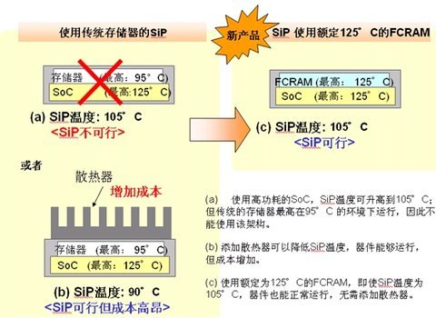 如圖1所示,迄今為止,使用傳統的存儲器,SiP發揮受限,而使用新型FCRAM產品就可以解決這一問題。圖1(a)介紹的SiP架構上使用的高性能SoC功耗較高,產生的熱量可使SiP溫度上升到105℃。因為SoC的最高溫度額定為125℃,所以操作能夠正常進行,但使用傳統的存儲器僅可在最高為95℃的溫度環境下運行,因此不能使用這一SiP架構。