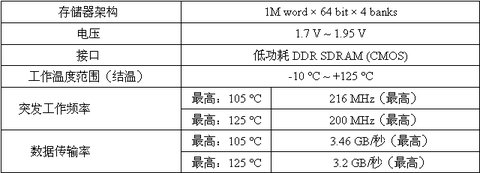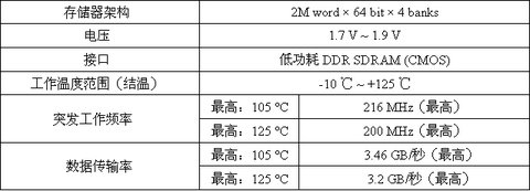 工作溫度是125℃時,新型FCRAM通過使用64bit總線寬并在最高工作頻率為200MHz運行時,可以提供3.2 GB/秒的數據傳輸率,這是傳統的DDR2 SDRAM速度的兩倍。若工作溫度不高于105℃(≤ 105℃),在216 MHz的工作頻率下運行時,產品的數據傳輸率將增加到3.46 GB/秒。