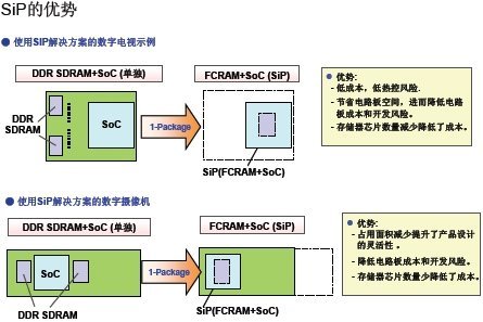 目前,市場對消費類數字產品的性能、速度和開發成本的要求越來越高。為滿足這些需求,就會更多地使用SiP,要求它同時整合帶有SoC的存儲器芯片。使用SiP可以減少元器件數量并節省電路板空間,進而能夠降低系統成本。使用SiP還能簡化高速存儲器開發或采取降噪措施等設計。