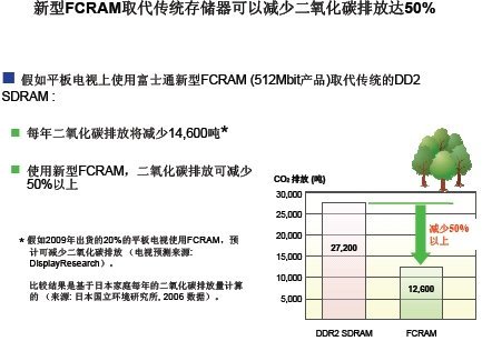 通過將總線寬擴大至64 bit、減少工作頻率和使用終端電阻(*2),與兩個使用16 bit總線寬的傳統DDR2 SDRAM存儲器芯片相比,新型FCRAM可降低功耗最高達50%。這些新型FCRAM可以減少消費類電子產品的存儲器的二氧化碳排放達50%。