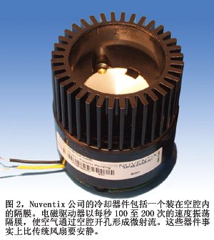 一種方法是Nuventix公司用于其SynJet無風扇冷卻器的合成射流(synthetic-jet)設計。SynJet需要的電流遠小于一只電機,采用5V電源工作。冷卻器使用一個電磁耦合的隔膜,通過極小的噴嘴脈動出高速空氣射流。一旦氣體離開噴嘴,就會裹挾周圍的空氣與它一起拉動空氣,這很像龍卷風拉動周圍的空氣。