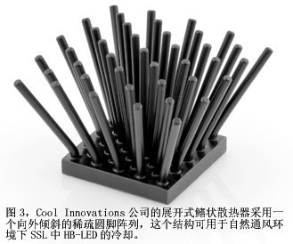 被動散熱器也在尋求創新。Cool Innovations公司的展開式鰭片散熱器性能超過等效的直立式鰭片散熱器(參考文獻5)。一個1.5英寸高、1 英寸2的直立式鋁制鰭片散熱器的熱阻為16.14°C/W,而展開式同等散熱器的熱阻為12.65°/W,改善了22%。一個2英寸高、5平方英寸的直立式散熱器的熱阻為0.74°C/W,相比之下,展開式為0.64°C/W,降低了14%(圖3)。