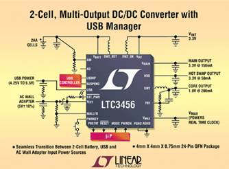 凌特公司(Linear Technology)推出完整的電源管理系統集成電路 LTC3456,該器件專為由兩節堿性/鎳鎘/鎳氫金屬電池、USB 或墻上適配器供電的便攜式應用而優化。LTC3456 可向固定 3.3V 主輸出提供高達 150mA 電流,以及向一個可調(VBATT 到 0.8V)內核輸出提供高達 200mA 電流以為微處理器、微控制器和其外部設備電路供電。此外,LTC3456 能夠為閃存卡和永遠有效的 VMAX 提供一個 3.3V/50mA 熱插拔 (Hot SwapTM) 輸出,以向實時時鐘供電。LTC3456 采用纖巧扁平(4mm x 4mm x 0.75mm)24 引腳 QFN 封裝,非常適用于空間敏感封裝的便攜產品。