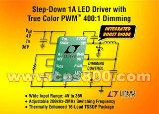 10月19日北京,凌特公司(Linear Technology Corporation)推出一款 36V、2MHz降壓型 DC/DC 轉(zhuǎn)換器 LT3474,這專為用作一個(gè)恒定電流 LED 驅(qū)動(dòng)器而設(shè)計(jì)。一個(gè)內(nèi)部檢測電阻器和調(diào)光控制器使其成為需要高達(dá) 1A 電流的 LED 驅(qū)動(dòng)之理想選擇。在一個(gè) 35mA 至 1A 的寬電流范圍內(nèi)保持了高輸出電流準(zhǔn)確度。獨(dú)特的 True Color PWMTM 電路實(shí)現(xiàn)了 400 : 1 的調(diào)光范圍,而不會(huì)產(chǎn)生采用 LED 電流調(diào)光時(shí)常見的任何彩色漂移現(xiàn)象。憑借其 4V 至 36V 的寬輸入電壓范圍,LT3474 可調(diào)節(jié)眾多類型的電源,從四節(jié)堿性/鎳鎘/鎳氫電池和 5V 邏輯電源軌到未經(jīng)調(diào)節(jié)的交流變壓器和汽車電源系統(tǒng)等一應(yīng)俱全。其開關(guān)頻率可被設(shè)定在 200kHz 至 2MHz 的范圍內(nèi),因而允許采用纖巧的電感器和陶瓷電容器。再加上耐熱增強(qiáng)型 TSSOP-16 封裝,它為驅(qū)動(dòng)高電流LED提供了一種非常緊湊的解決方案。