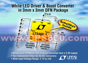 凌特公司日前推出雙升壓型DC/DC轉(zhuǎn)換器LT3466-1,它是采用扁平3mm×3mm DFN封裝的白光LED驅(qū)動器和升壓型轉(zhuǎn)換器。