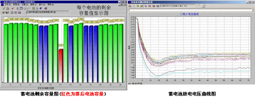 利用本系統的快速放電測量操作,可以以0.15C的放電率,在短短的7~30分鐘之內快速預測被測蓄電池組的容量。并且可以預測出每個單體電池的剩余容量,其準確度在80%以上。利用這一項功能,可以對大量的蓄電池進行快速測量,大大提高測量的效率,便于快速了解蓄電池的狀態。該系統具有24對探頭,可以直接連接到每個單體蓄電池的兩端,在系統放電測試過程當中,每個單體電池的情況可以利用監測軟件很直觀的反映出來,而及時發現落后電池,為蓄電池組的維護提供便利。