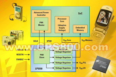 只要采用美國國家半導體的LP5550芯片,便可按照數字處理器的實際需要將供電電壓調至最低,這樣可大幅減少處理器的功耗。LP5550芯片內置一個專為處理器核心提供可適性供電電壓的降壓穩壓器以及另外三個固定電壓穩壓器。這三個固定電壓穩壓器可為低功耗單芯片系統的輸入/輸出環、振蕩器/鎖相環路以及存儲器提供供電。PWI接口可以控制這款LP5550芯片的功能,讓數字處理器可以輕易與LP5550芯片保持聯系。