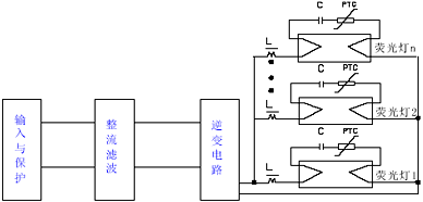 上圖中,假設熒光燈1 去激活,則PTC1 動作,燈1 的燈絲電流接近為0;但其它熒光燈的工作不會受到影響。這樣,用戶就不必為到底是哪只燈壽命終了或者是鎮流器損壞這樣的問題而困擾。