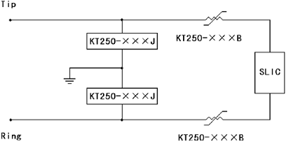 ×J 半導體固體放電管一起用于總配線架的保安單元中,可以滿足過流和過壓保護的要求,同時幫助保安單元滿足中國通信行業標準YD/T 694-1999-2002、北美TelcordiaGR-974 及ITU-T K.20 等標準,典型的使用電路如上圖所示。本公司KT250 系列熱敏電阻中的部分規格還可以滿足某些要求快速保護的領域,如維持電流為90 毫安的KT250-090 和KT250-090B規格中的部分產品可以滿足1.0 安培動作時間小于0.3 秒的要求,保證動作時間小于交換機保護元件的動作時間,使保護過程更加安全可靠。