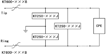 本公司提供的KT600-B 系列高分子PTC 熱敏電阻與固體放電管一起應用于各種用戶設備(CPE),如傳真機、56K 調制解調器、電纜、ISDN、ADSL、HDSL 等調制解調器、應答機、POS設備等,可使之滿足UL1950 和FCC68 部分的雷擊電涌、電力接觸和電力感應等要求。典型的保護電路如圖所示,電路中可能需要串接一只電阻,以保證線路中的電流不超過固體放電管最大額定電流。這樣的解決方案具有可以復位、可多次重復提供保護的優點。通過使用本公司KT600-B 和相應的固體放電管等設計的一次、二次或三次保護電路,還可以使網絡設備滿足Telcordia GR-1089 要求。
