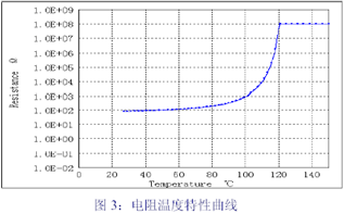 測(cè)試數(shù)據(jù)顯示:當(dāng)變壓器正常工作即輸出功率為額定2W 時(shí),變壓器的次級(jí)電壓在7V 左右,次級(jí)由表1 和圖1 可知,與變壓器初級(jí)線圈串聯(lián)的PPTC 熱敏電阻KT250-030BL 在常溫下(25 度)工作時(shí)維持電流可以達(dá)到0.03A,因此變壓器正常工作時(shí)(PPTC 表面溫度70℃左右) KT250-030BL 可以長(zhǎng)期保持在低阻狀態(tài)。而當(dāng)變壓器輸出端電路發(fā)生故障導(dǎo)致次級(jí)短路時(shí),次級(jí)電流約為1.05A,對(duì)應(yīng)初級(jí)電流約為0.05A, KT250-030BL 熱敏電阻和線圈的溫度開(kāi)始升高,當(dāng)PPTC 表面溫度達(dá)到100℃左右時(shí)阻值迅速發(fā)生階躍性的變化,電阻值會(huì)變得足夠大,將電路中的電流限制在很低的范圍內(nèi)。此時(shí)電路中的電壓幾乎都加在熱敏電阻的兩端(該系列產(chǎn)品已通過(guò)1000 小時(shí)的通電老化測(cè)試(UL 認(rèn)證測(cè)試項(xiàng)目)),變壓器的實(shí)際輸入電壓值很小,實(shí)現(xiàn)了對(duì)變壓器的保護(hù)。實(shí)際測(cè)試表明,在該變壓器次級(jí)短路時(shí), KT250-030BL 熱敏電阻在50 秒左右動(dòng)作(動(dòng)作時(shí)間可以根據(jù)實(shí)際使用需要進(jìn)行設(shè)計(jì)調(diào)整,設(shè)計(jì)時(shí)還會(huì)考慮避免電流的正常波動(dòng)導(dǎo)致誤動(dòng)作),動(dòng)作后PPTC 熱敏電阻的最高表面溫度不超過(guò)130℃(R/T 曲線見(jiàn)圖3)。因此,不會(huì)導(dǎo)致變壓器的損壞。在切斷電路,排除電路故障后,變壓器仍可正常使用(該系列產(chǎn)品已通過(guò)重復(fù)動(dòng)作6000 次的耐久測(cè)試(UL 認(rèn)證測(cè)試項(xiàng)目)