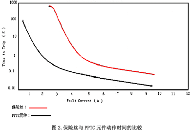 保險絲屬于一次性使用的器件,熱容較低,采用這種保護(hù)方案時,要選用的保險絲都具有一個非常高的額定電流值,通常是實(shí)際正常工作電流值的十倍甚至更大。故障情況下保險絲表面溫度升高,如果設(shè)備持續(xù)處于超正常工作電流的故障情況下,而該電流又沒能達(dá)到使保險絲快速熔斷的水平,那么保險絲的溫度就有可能超出允許的范圍,設(shè)備將處于極不安全的狀態(tài)。同時,大多數(shù)地方安全管理機(jī)構(gòu)對電信網(wǎng)絡(luò)設(shè)備的要求中明確提出電信設(shè)備在發(fā)生過電流或雷擊事件時,必須滿足規(guī)定水平的耐受性。常見的方法是選用熔斷反應(yīng)時間較長的保險絲來提高耐受性,但保險絲對故障做出反應(yīng)所需要的時間越長,通過的能量(I2t)就越多,從而造成電子元器件損壞的可能性就越大。這樣一來,選用防雷擊的保險絲就存在較多的限制。PPTC器件具有可自恢復(fù)、精度高、可靠性高、熱容高、體積小等優(yōu)點(diǎn)。有實(shí)驗數(shù)據(jù)顯示,相同額定電壓和耐電流的PPTC器件過流保護(hù)元件與保險絲相比較具有動作時間快、動作后表面溫度更低、功率損耗更小等優(yōu)點(diǎn)。圖2是電信常用的保險絲與PPTC元件在相同故障電流下的動作時間的比較。